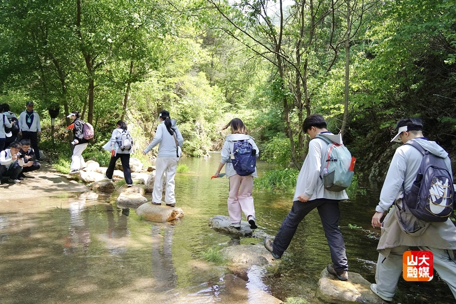Participants cross a river along the hiking route. [Photo/Shandong University]