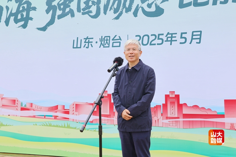 Shandong University President Li Shucai delivers a speech at the opening ceremony of the hiking event at Kunyu Mountain in Yantai, Shandong Province. [Photo/Shandong University]