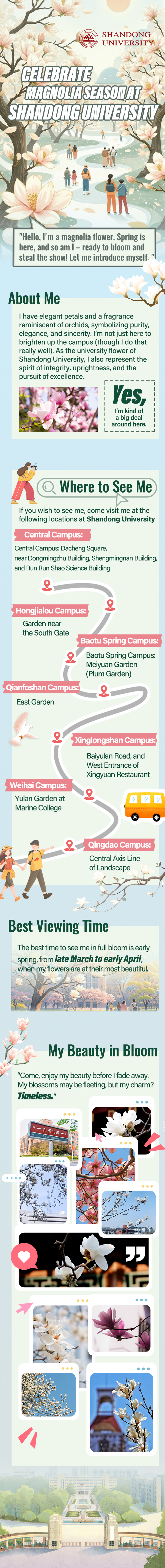 Magnolia flowers are in full bloom at Shandong University! As the university's official flower, they symbolize integrity, morality, and the pursuit of excellence. Check out these recommended spots to admire their beauty. Don't miss their peak bloom!
