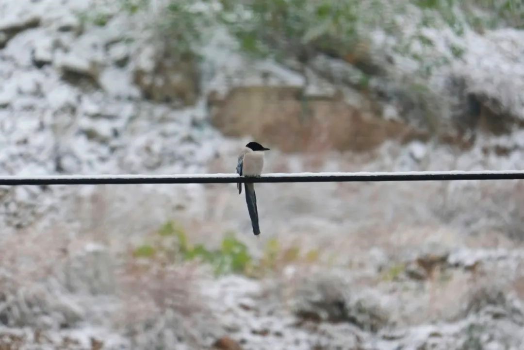 A bird perches on a cable against a snowy backdrop. [Photo/view.sdu.edu.cn]