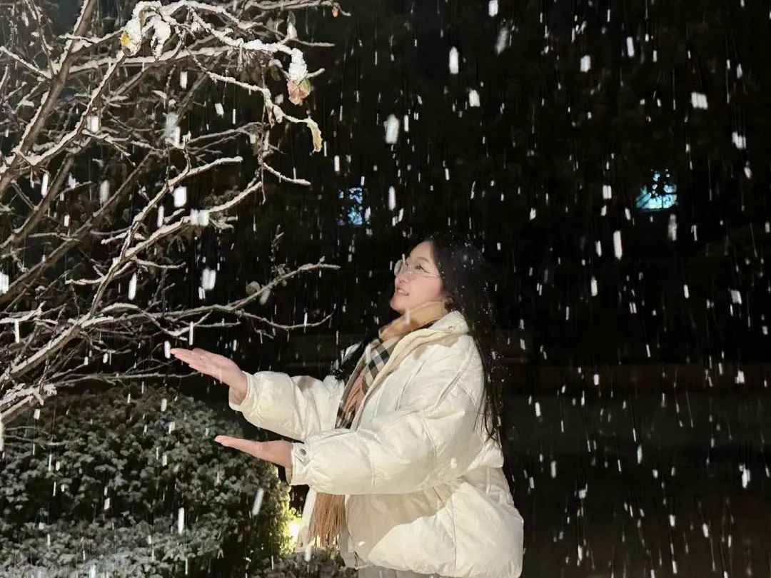 A student poses for a photo in the snow at Shandong University. [Photo/view.sdu.edu.cn]