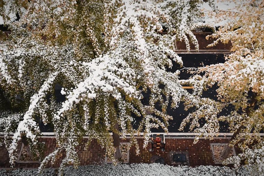 Ginko trees are blanketed in snow, creating picturesque views in early winter. [Photo/view.sdu.edu.cn]