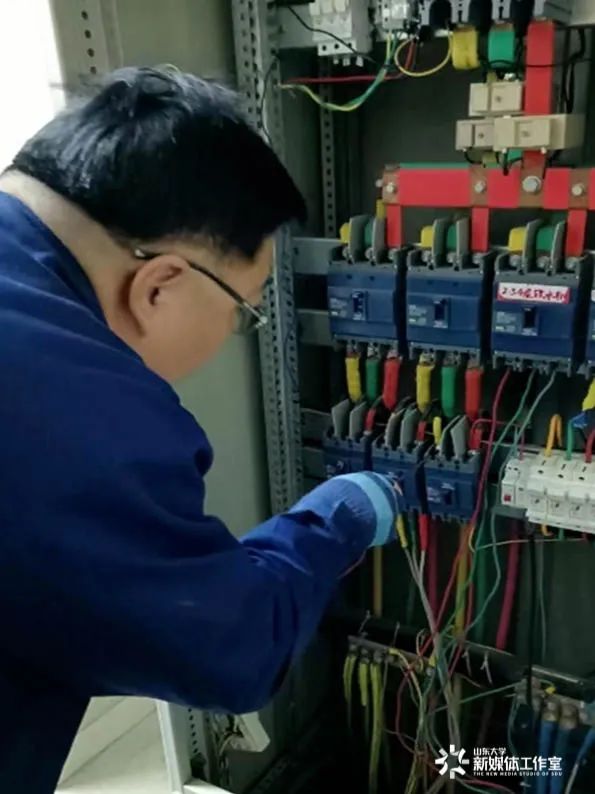A worker inspects the circuit board at SDU. During the Spring Festival holiday, the university's libraries, cafeterias, laboratories, and self-study rooms maintained regular hours, and water, electricity, and heating services continued to be provided. [Photo/sdu.edu.cn]