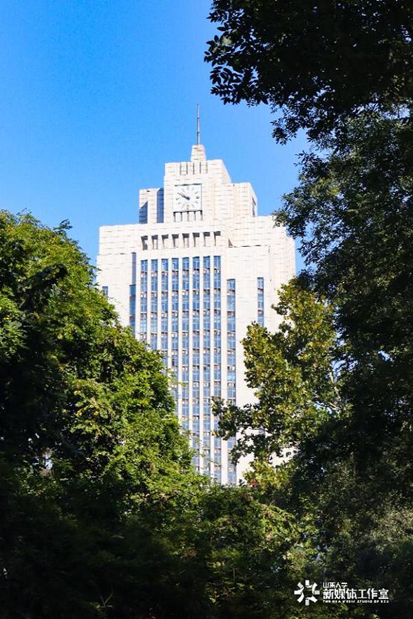 Zhixin Building, the main building at Shandong University, stands high behind the vibrant green trees in the sunny spring weather. [Photo/WeChat account: sdu-1901]