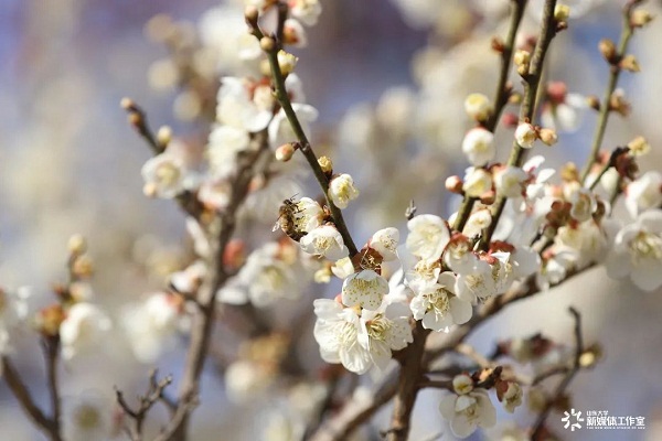 A photo captures a busy bee collecting nectar from blooming flowers at Shandong University. [Photo/WeChat account: sdu-1901]