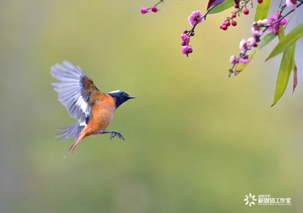 A bird flies to the blooming flowers. [Photo/WeChat account: sdu-1901]