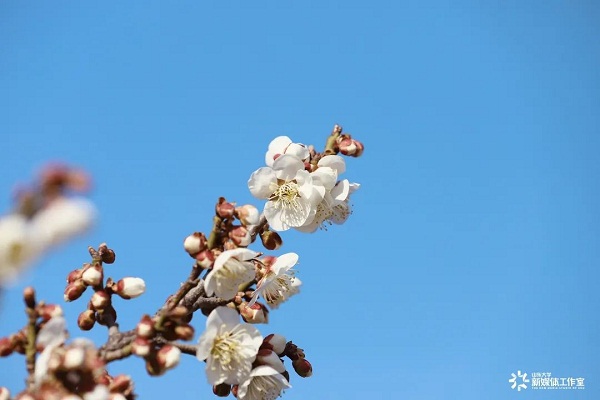 White flower blossoms scattered along tree branches provide a lovely contrast with the blue sky at Shandong University. [Photo/WeChat account: sdu-1901]