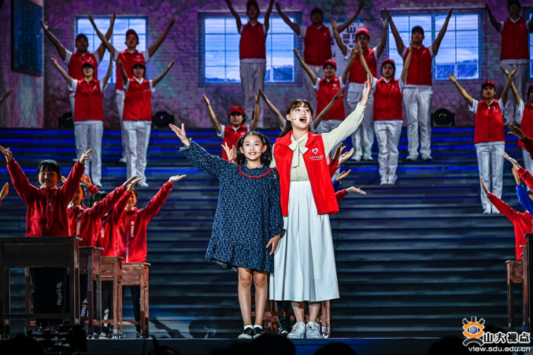A girl and an actress sing the song "We are holding hands". [Photo/sdu.edu.cn]