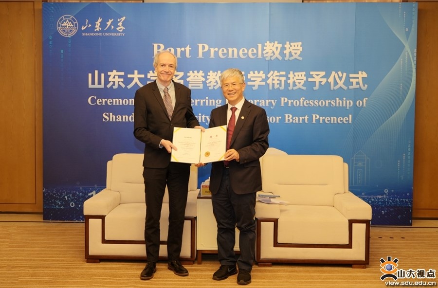 Professor Bart Preneel from University of Leuven in Belgium visited Shandong University on Dec 11 and 12. The university's president, Li Shucai, met with him and conferred upon him the title of honorary professor at Shandong University.