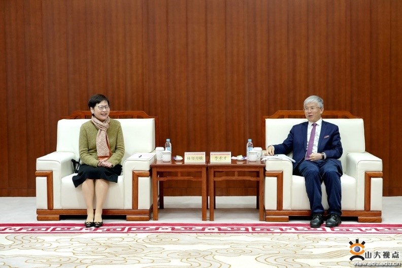 Shandong University President Li Shucai (Right) meets with Carrie Lam, former Chief Executive of the Hong Kong Special Administrative Region on Nov 18. [Photo/Shandong University]