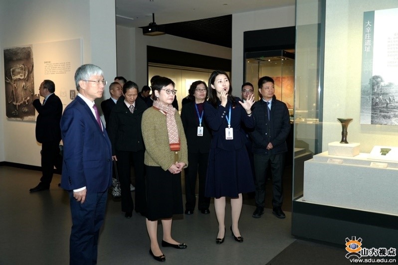 Carrie Lam (central), visits the archaeological achievements exhibition at Shandong University on Nov 18. [Photo/Shandong University]