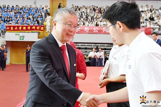 Ren Youqun (left), Party Secretary of Shandong University, shakes hands with a student of class 2024 at the welcome ceremony on Sept 21. [Photo/Shandong University]
