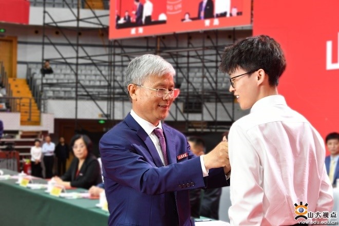 Li Shucai (left), president of Shandong University, pins the school badge for a freshman at the opening ceremony on Sept 21. [Photo/Shandong University]