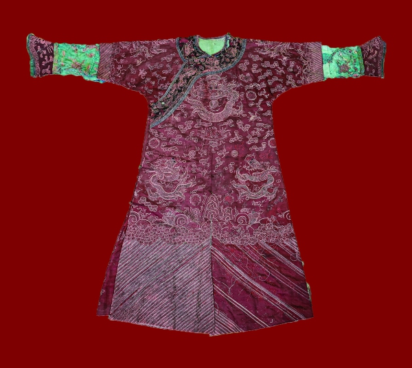 Originally worn by Hayes himself, the crimson silk robe represents a typical attire worn by ordinary officials during festive occasions in the late Qing Dynasty. Adorned with intricate embroidery featuring a diverse array of decorative motifs, such as auspicious clouds, cranes, bats, and longevity characters, the robe is a testament to the rich cultural heritage of the era.