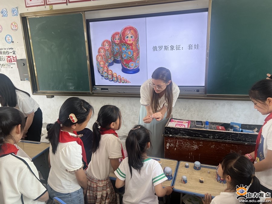 An international student from Shandong University introduces Russian culture for pupils at a volunteer class in Queshan county, Henan province. [Photo/Shandong University]