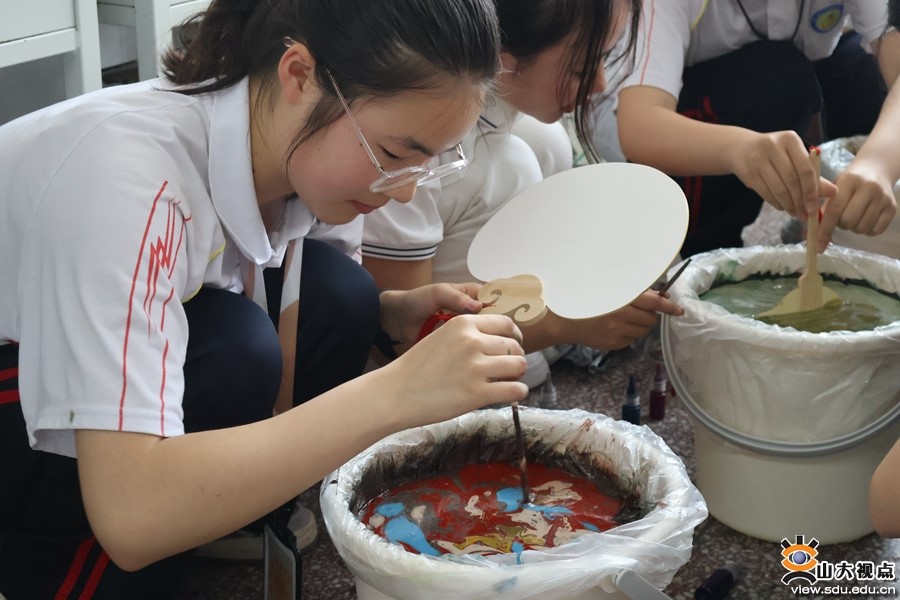 Students experience lacquered fan making during the class in Queshan county, Henan province. [Photo/Shandong University]