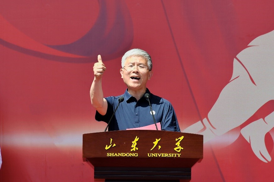 Li Shucai, president of Shandong University, delivers a keynote speech at the opening ceremony of the 2024 Shandong University Track Competition. [Photo/sdu.edu.cn]