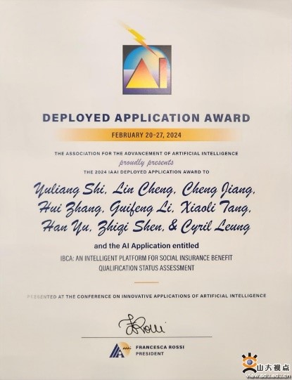 The certificate of AAAI Innovative Application Award for Bareway. [Photo/sdu.edu.cn]
