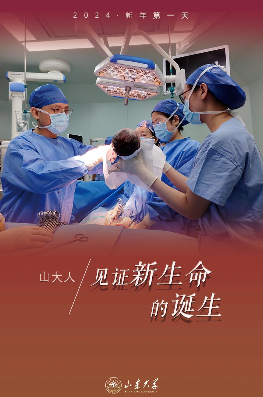 Gong Yanmin (first from left), attending physician of the Obstetrics Department of Qilu Hospital of Shandong University, delivers the first baby in the hospital in the new year. [Photo/sdu.edu.cn]