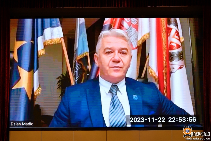 Dejan Madić, president of the University of Novi Sad delivers a keynote speech via a video link. [Photo/sdu.edu.cn]